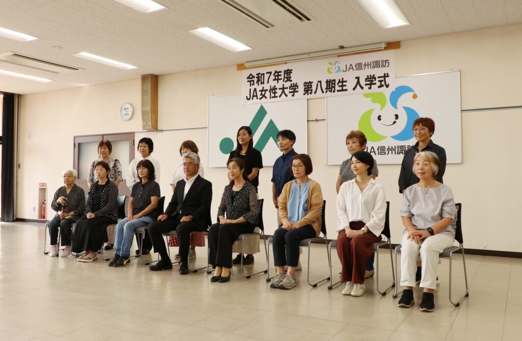 JA信州諏訪は9月10日、諏訪市のJA本所で、JA女性大学第8期生の入学式を開きました。新入生・在校生、JA職員ら計17人が参加。今期生から初めて、JA利用者専用ウェブサイト「組合員Myページ」を活用し、JAや大学生同士のコミュニケーションツールとして役立てます。初回講座として、各々のスマホに同サイトを登録。共有した集合写真を確認するなど、使用方法を学びました。
