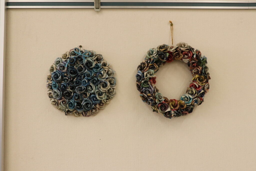 今回の講義は、JA職員が「9月に入学した学生同士が手芸を楽しみながらコミュニケーションを行い、親睦を深めるきっかけにして欲しい」と提案しました。また、同職員はJA女性部の藤森洋子部長が作ったバラのリースを見て、「新聞紙で作られたとは思えないくらい可愛い!」と感銘を受けました。身近で、お金をかけずにできる新聞紙の有効活用も学べるとして、講義に取り入れました。