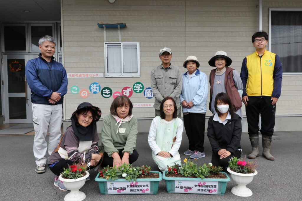 JA信州諏訪女性部諏訪市ブロック四賀支部と諏訪市のJA諏訪支所は10月21日、花育活動「花いっぱい運動」を行いました。部員とJA役職員計11人が参加。JA施設近くの花壇を整備したり、花苗を植えたプランターを地元の児童発達支援センターに寄贈したりして地域の景観美化に努めました。