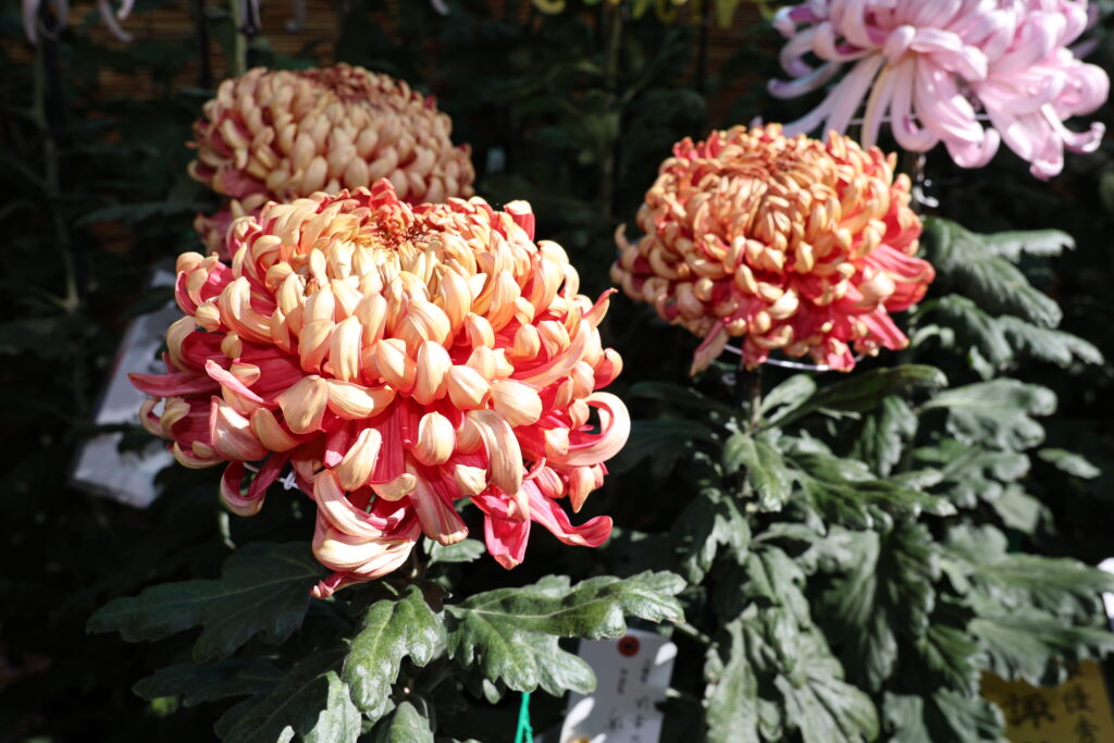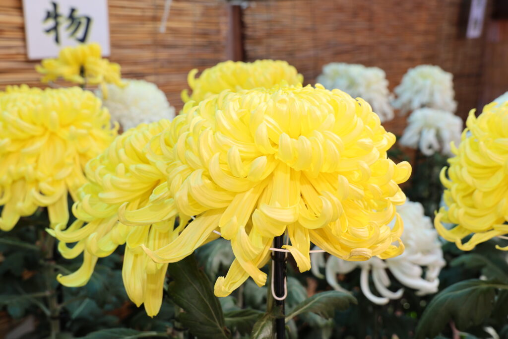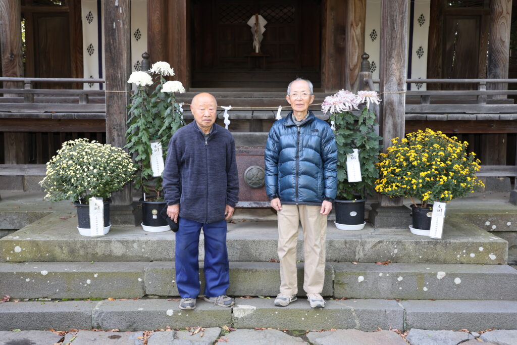 昨年から引き続き、同市の諏訪護国神社にも菊花を奉納。小林宗吉会長と奥山幸茂顧問が育てた、3本仕立ての盆養菊2鉢と、小菊をドーム状に仕立てるドーム菊2鉢が同社を飾っています。期間は同展の開催期間と同じです。