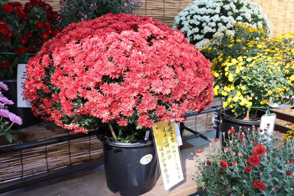 諏訪地域の菊愛好家でつくるJA信州諏訪健香会は10月29日から11月16日、諏訪市の諏訪大社で第42回諏訪大社上社奉献菊花展を開催しています。今年は昨年比27点増の117点の菊花が出品。菊舎6棟に鮮やかな菊花が並び、参拝者を楽しませています。最高賞にあたる「競技花の部」の最優秀賞(JA信州諏訪組合長賞)には、諏訪市の奥山幸茂さん(86)が選ばれました。