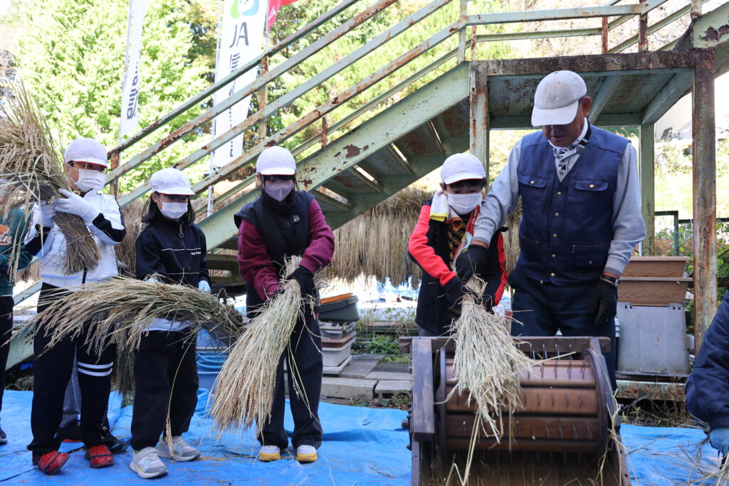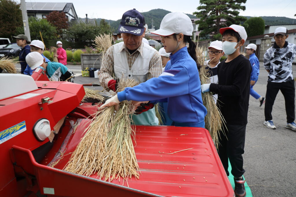 JA信州諏訪が2025年度、稲作支援を行う管内の小学校計8校の脱穀が10月23日に無事終了しました。児童は昔ながらの足踏み脱穀機や千歯こき、唐箕とハーベスターを使い体験。初めて使う道具にわくわくしながら稲作を学びました。