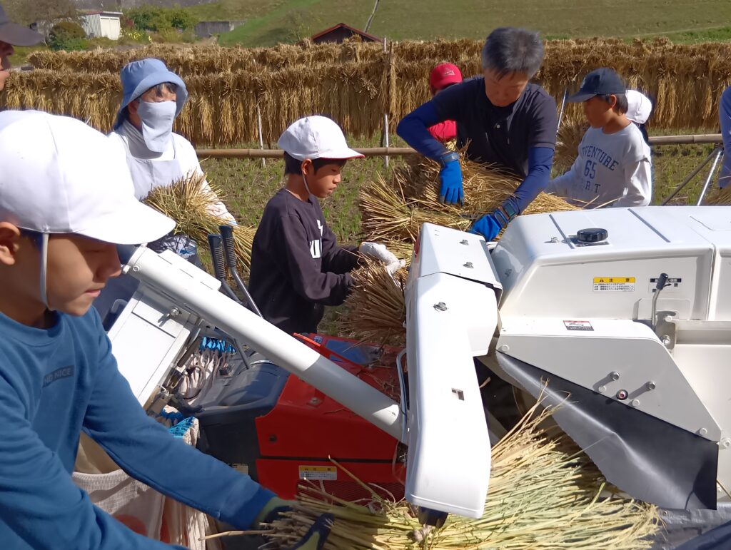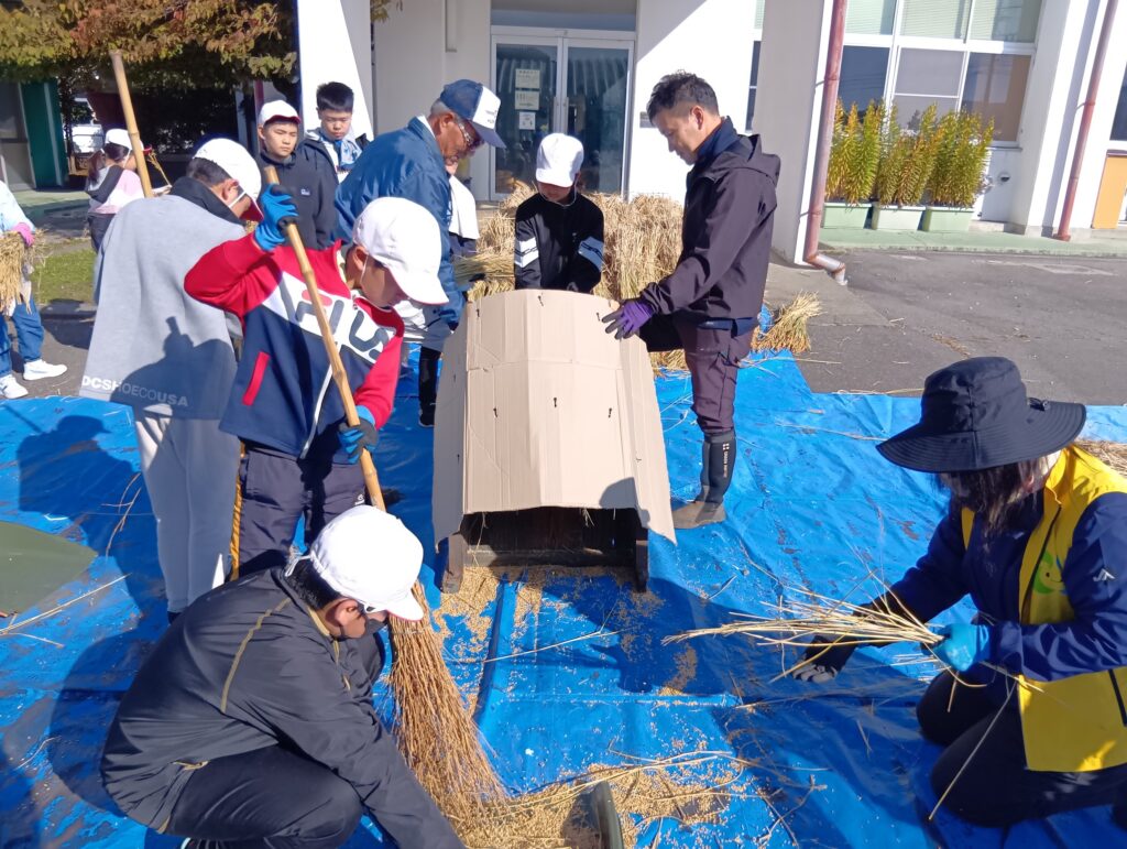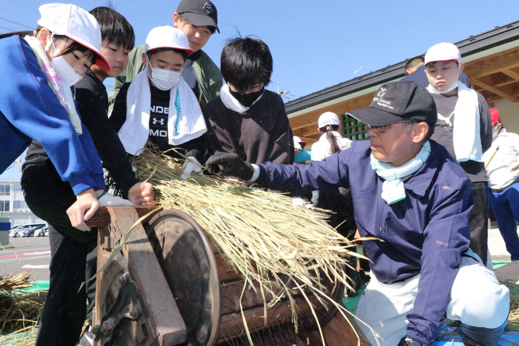 5年生の名取琥太郎さん(11)は「足踏み脱穀機は使い方が難しかったが、コツを掴むときれいに稲から籾が取れてうれしかった」と話し、宮坂龍彦さん(10)は「しっかり稲を持っていないと道具に吸い込まれてしまうことが難しかった。慣れると上手に出来た」と話しました。