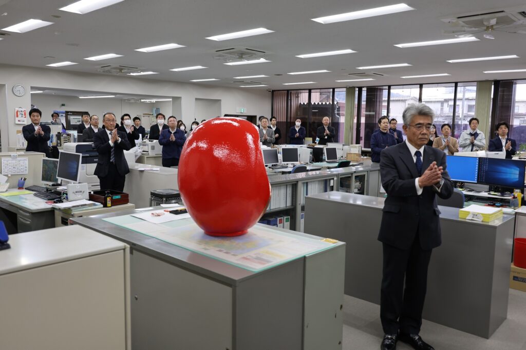 JA信州諏訪は1月5日、部署ごとに仕事始め式を開きました。諏訪市のJA本所では常勤役員と本所職員の約50人が出席。役職員の代表者がだるまに目を入れ、組合員や地域、JAの発展を祈願しました。