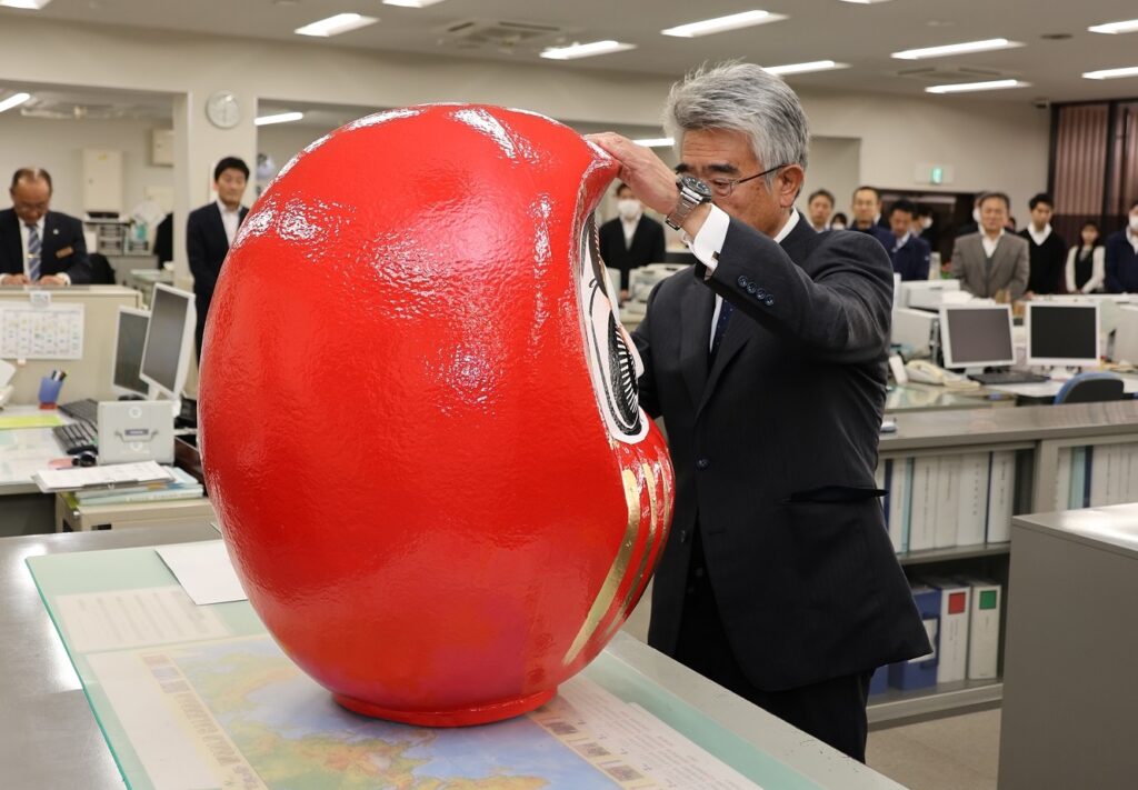 写真=神棚に祈願した後、小平組合長をはじめ代表者がだるまに目を入れました(長野県諏訪市で)