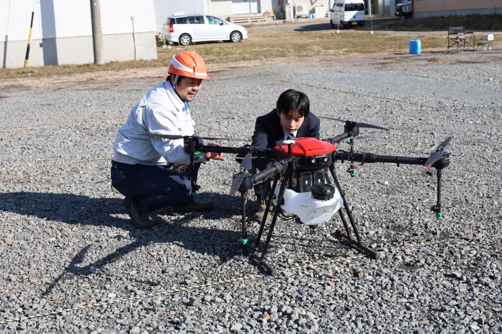 この日は、講義で農業用ドローンの活用が農作業の省力化や労働不足解消につながり、持続可能な農業の実現に貢献することを学びました。その後、基本的な操作方法を確認。講師同伴のもとコントローラーを操作し、機体に付属しているタンクに農薬を見立てた水を入れ、校内のほ場上空から散布しました。農業用ドローンにほ場の形状を記憶させ、自動で作業を行う機能も体験。生徒は質問をしながら知識を深めました。