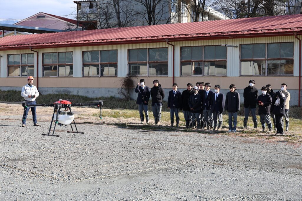富士見町の富士見高校園芸科の3年生15人は12月17日、同校のほ場で農業用ドローンの操縦を体験しました。4月から座学で農業用ドローンの基礎知識を習得。この日の実技でスマート農業などの先進的な農業技術への理解をさらに深めました。