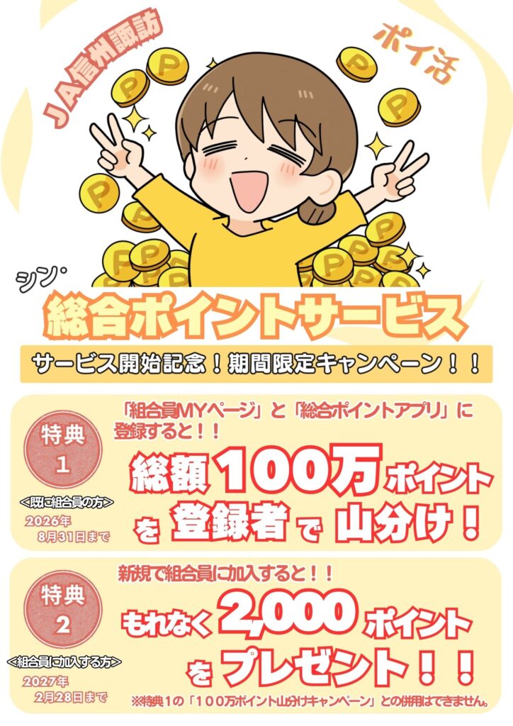 JA信州諏訪の組合員の方で、期間中に「組合員Myページ」と「総合ポイントアプリ」の両方にご登録いただいた方で100万ポイントを山分けできる!太っ腹なキャンペーンです!!